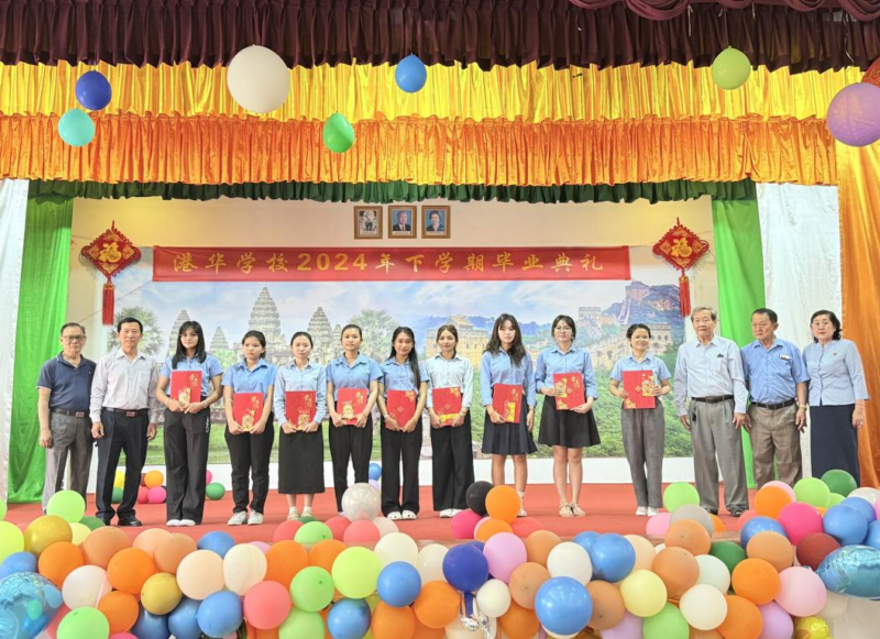 本网报道:2024年12月31日,公立港华学校2024年下学期毕业典礼在学校礼堂隆重开幕,西港市领导Keo chanra,西港柬华理事常务副会长陈明金先生、副会长吕木庭先生、陈奕民先生、涂文华先生,理事蔡木永先生,港华学校的郑清帕校长、朱俊彬主任、谢福主任和全体教师、毕业班学生及家长代表近500人参与了本次典礼。